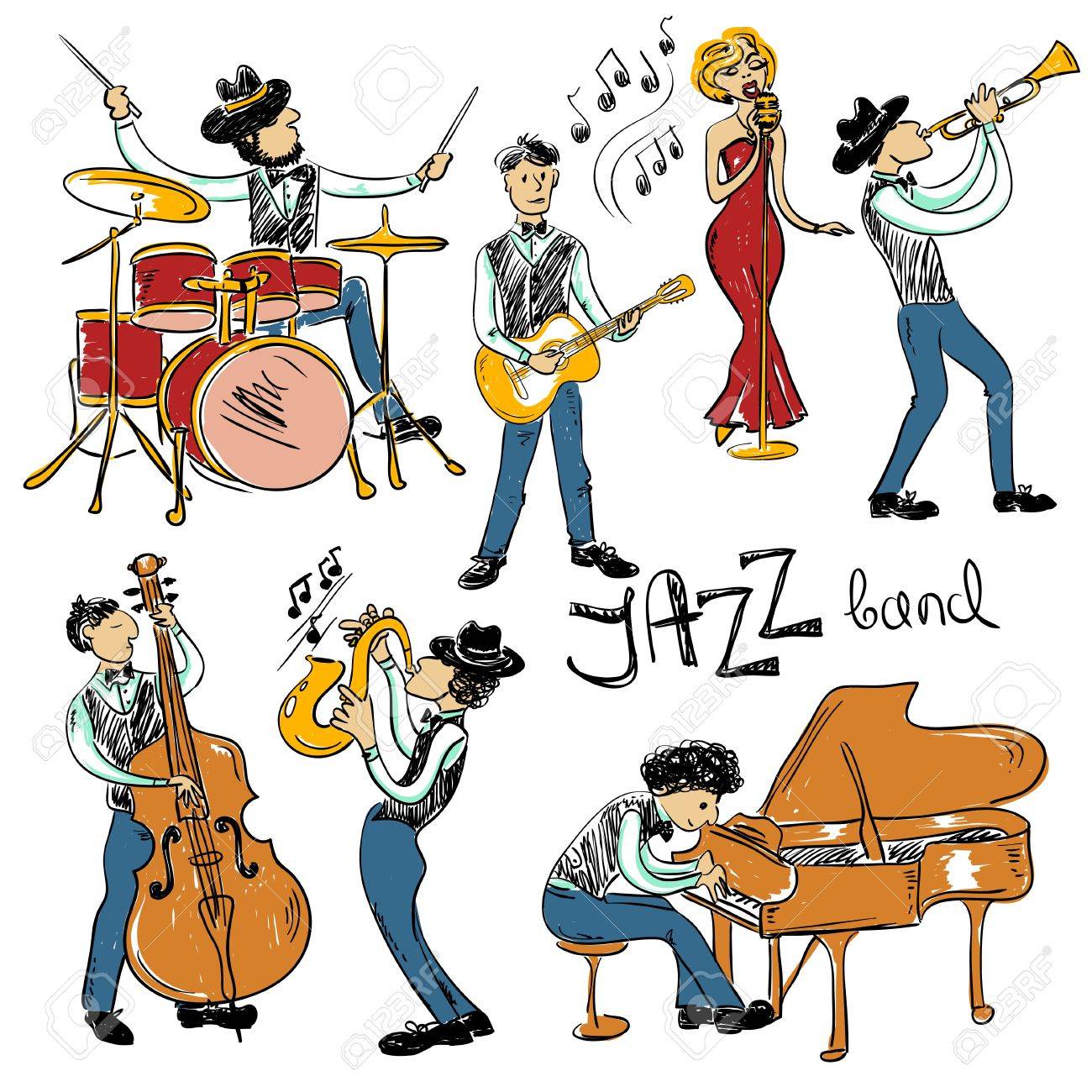 Funny Set Of Isolated Colorful Hand Drawn Jazz Musicians Jazz Band Icons Royalty Free Cliparts Vectors And Stock Illustration Image 60154128